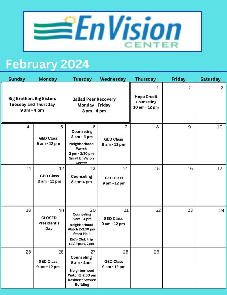 Each month you can find resources that include counseling services and GED classes. The Center supports community partners that include Ballad Health Peer Recovery, Big Brothers Big Sisters, and Mount Rogers Adult Education.